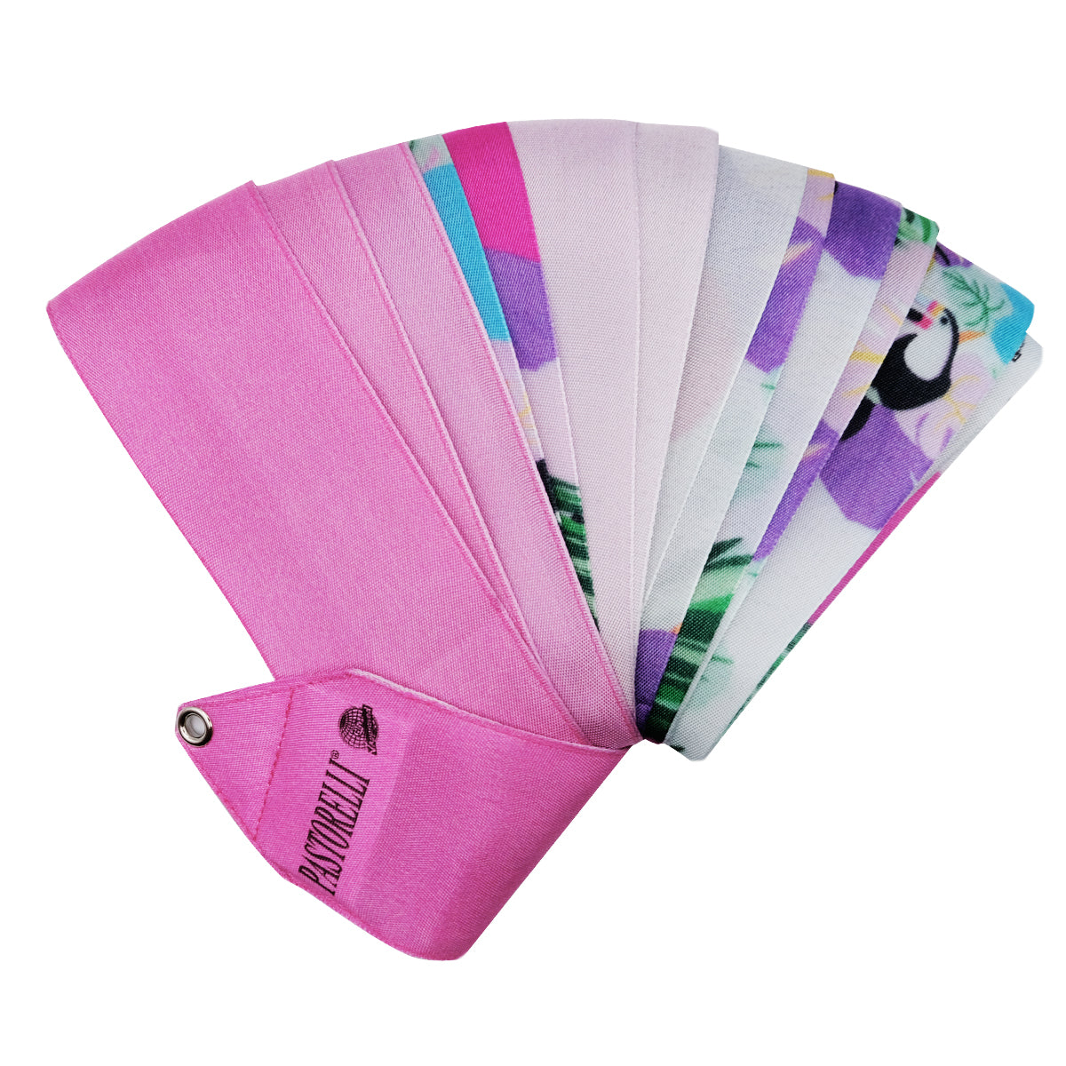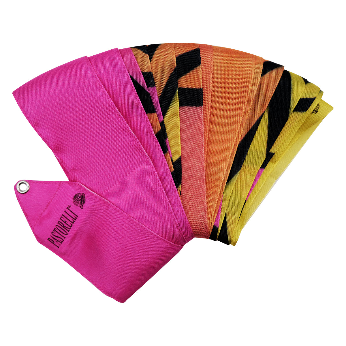 The PASTORELLI - Antigua Arche Toucan Junior Ribbon is a 5-meter FIG approved rythmic gymnastics ribbon made in Italy. It is designed for junior gymnasts and features a digitally printed flame design on a high-quality, soft rayon fabric. Its non-electrostatic properties help prevent static cling during performances.